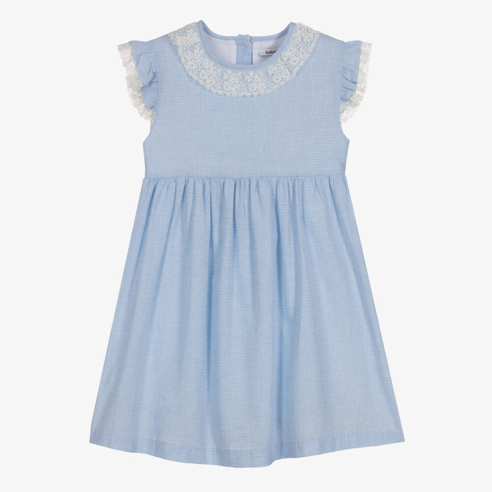 Exclusive to Childrensalon this lovely blue check dress for girls by Babidu, is made in soft cotton. The pretty capped sleeves and neckline have delicate white lace trims. It is lined in lightweight voile for comfort and has traditional wooden button fastenings on the back.