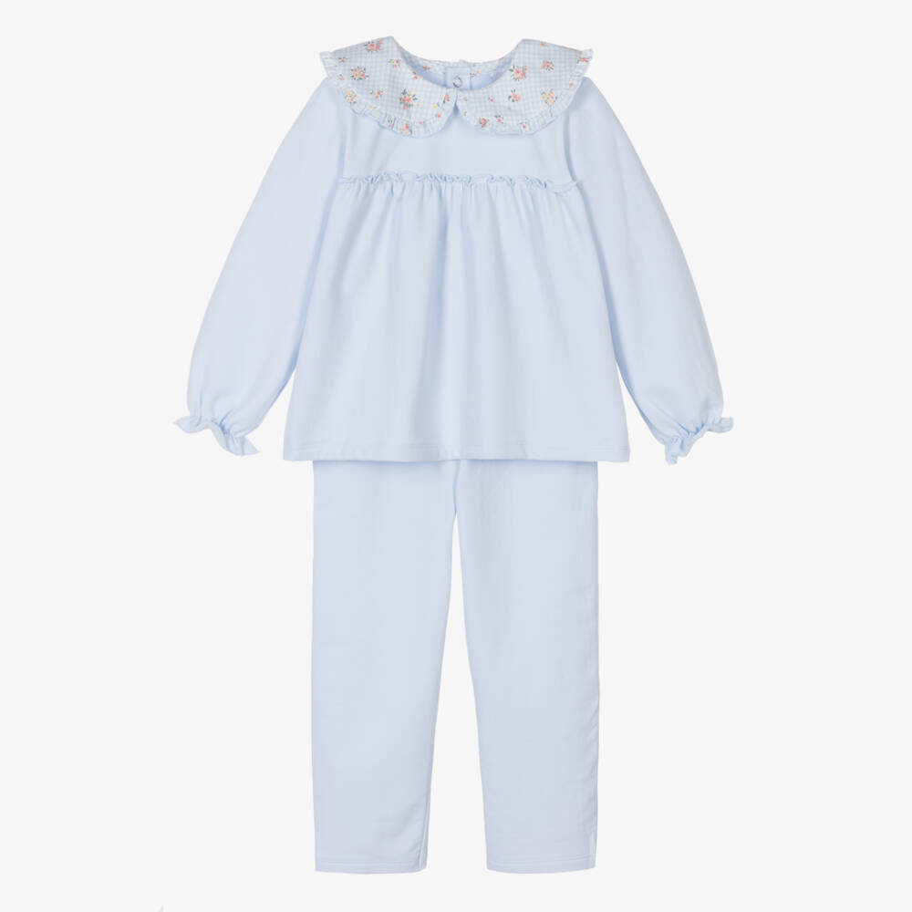 A lovely pale blue top and trouser set for girls by Spanish brand Babidu. Both pieces are made in soft cotton jersey and have a cosy fleecy inside. The top has frilly elasticated cuffs, with a classic ruffle-trimmed Peter Pan collar in a floral gingham pattern. It fastens easily with poppers on the back. The trousers have a gently elasticate waist for a comfortable fit.