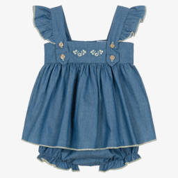 Turquoise blue dress for little girls by Babidu, softly woven in cotton seersucker. Patterned in an adorable gingham print, this flutter sleeve dress has bright coral orange smocking on the bodice for a timeless look and button fastenings on the front. Matching elasticated knickers complete this pretty look.