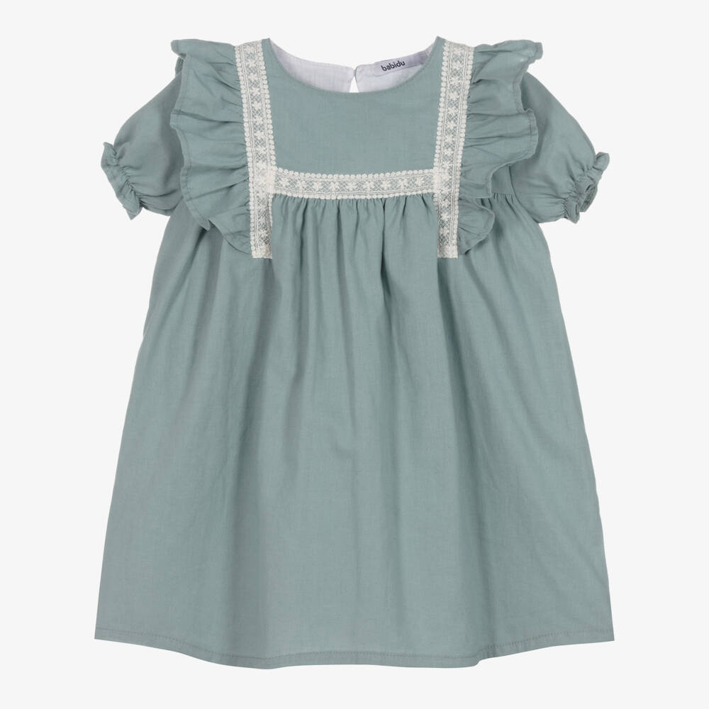 Exclusive to Childrensalon, a classically styled green dress for girls by Babidu, made in soft linen-feel cotton. It has sweet puffed sleeves, pretty ruffles and delicate ivory lace trims on the bodice. Lined in lightweight cotton voile for comfort, the dress has an elegant keyhole opening on the back, fastening with a traditional mother-of-pearl button.