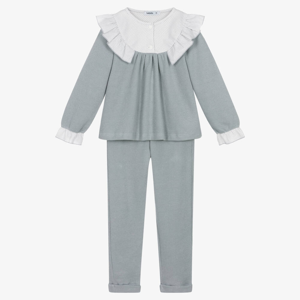 Pretty grey trouser set for girls by Babidu, knitted in soft cotton jersey. The top has lovely grey pinstripe trims on the frilled collar and cuffs, and fastens with ivory buttons on the chest. Matching bottoms with frilled cuffs complete the cute look.