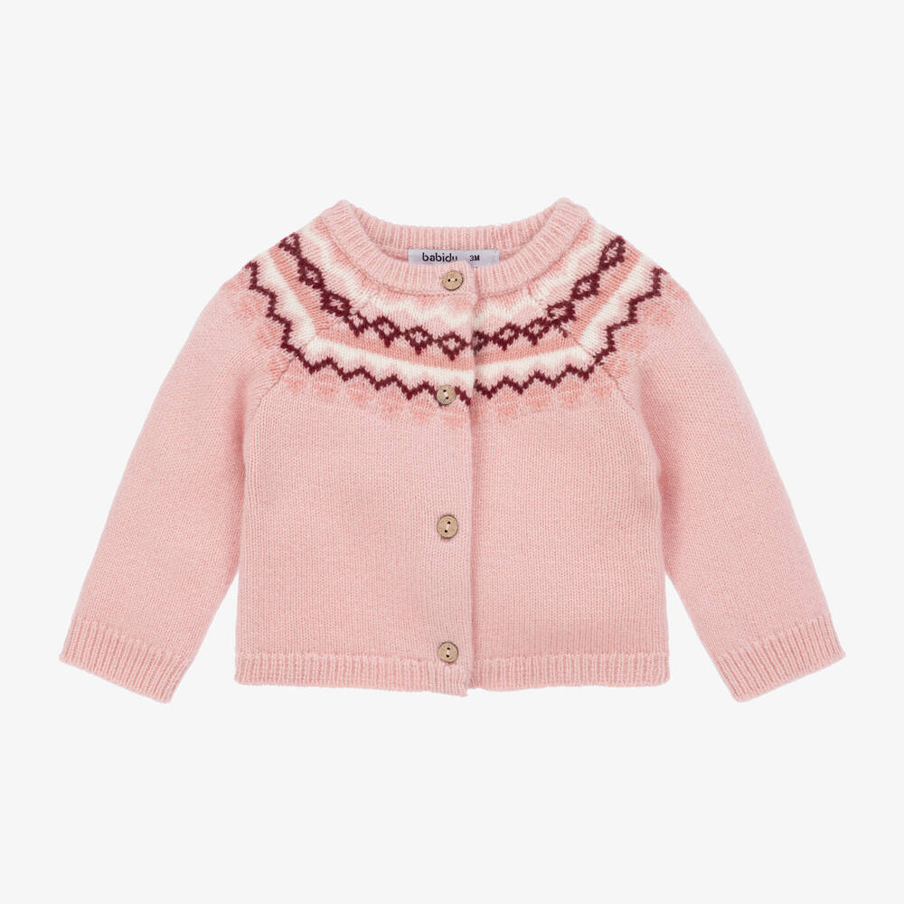 A pink cardigan for little girls by Babidu, with a charming Fair Isle design in burgundy red, pink and ivory. This cosy soft knitted layer contains a touch of wool for extra warmth and secure with natural buttons on the front.