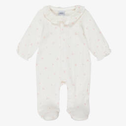 Light grey babygrow for boys and girls by Babidu, made in soft cotton-rich velour. Warm and cosy, this adorable one-piece has a cute bear face embroidered on the front with polka dot detailing and three-dimensional ears. It has a lightly ribbed neckline and easy popper fastenings on the back and between the legs.