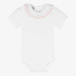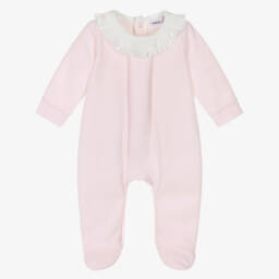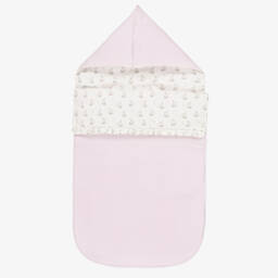 Pink two piece hat and mittens set by Babidu, for baby girls. The hat is made in a double layer of stretchy cotton jersey with a turned-up brim. The matching scratch mittens are elasticated on the cuffs with delicate scalloped trim.