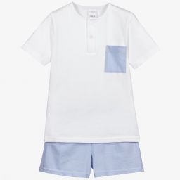 Exclusive to Childrensalon, white and pale blue short pyjamas for boys by Babidu, made in soft and stretchy cotton jersey. The white T-shirt style top has front button fastenings and a contrast blue patch pocket on the chest. The blue shorts have a comfortable elasticated waistband.