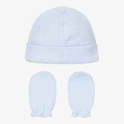 White two piece hat and mittens set by Babidu, for baby boys and girls. The hat is made in a double layer of stretchy cotton jersey with a turned-up brim. The matching scratch mittens are elasticated on the cuffs with delicate scalloped trim.