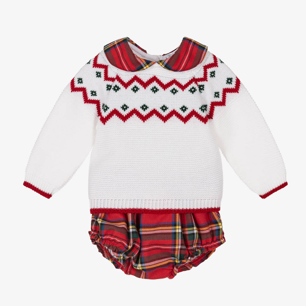 Sweet white and red shorts set for baby boys and girls by Spanish brand Babidu. The knitted white sweater has a red and green Fair Isle pattern and a red tartan collar. Warm and cosy with ribbed trims, it fastens neatly on the back with buttons. The red tartan shorts are made in soft cotton twill and are fully lined. They have an elasticated waistband and leg openings for comfortable wear.