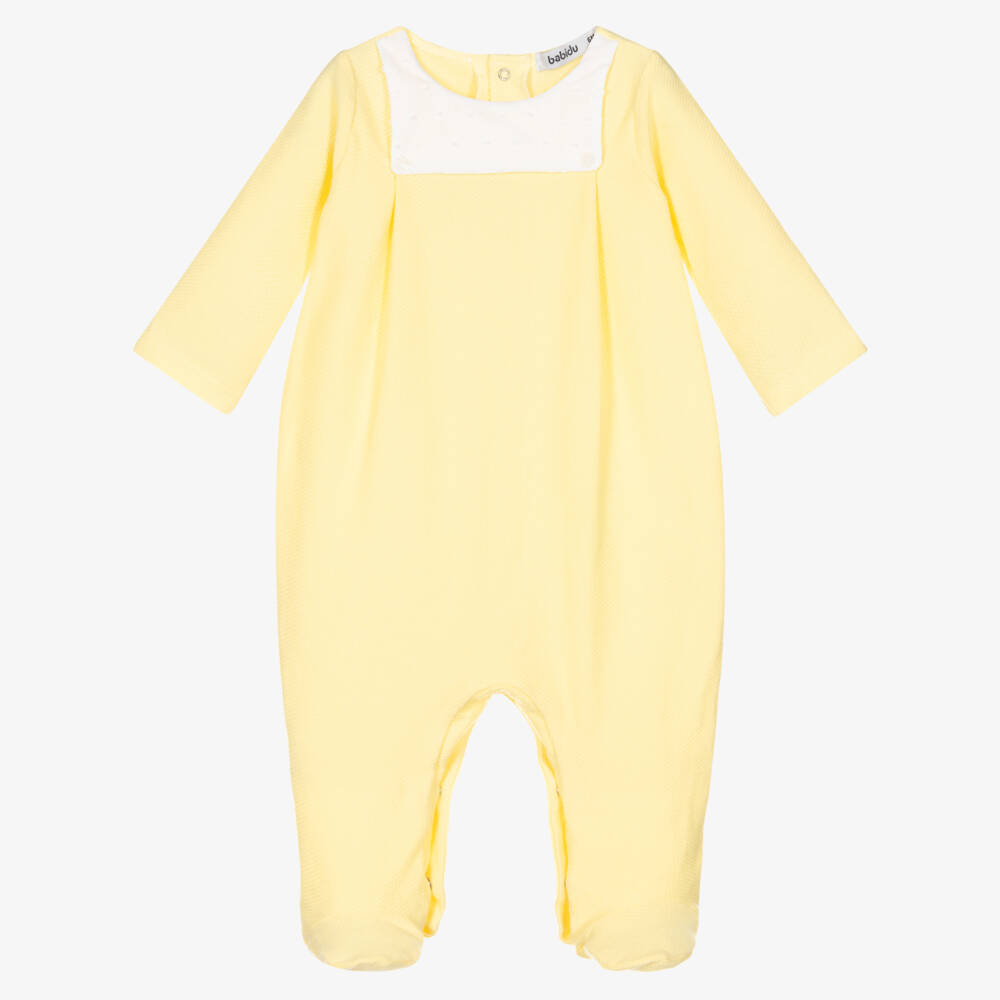 Adorable pale yellow babygrow for boys and girls, by Babidu. Made in soft cotton waffle jersey, it has a white bib front with sweet plumeti details, mother-of-pearl button trims, and popper fastenings for easy dressing.