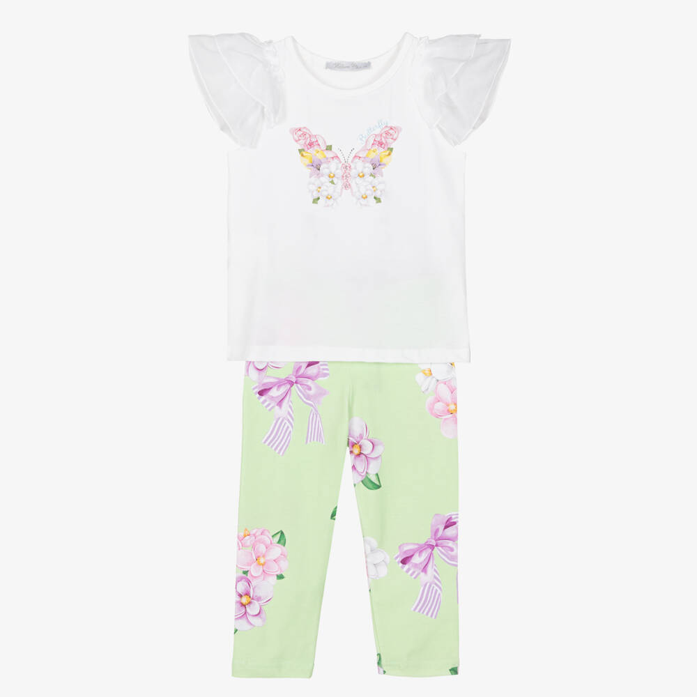 A lovely white and green leggings set for girls by Balloon Chic, made in soft cotton jersey. With lightweight voile ruffle sleeves, the white top has a beautiful floral butterfly motif on the front, detailed with sparkling diamantés. The full-length green leggings have a colourful floral and bow design and a gently elasticated waistband for a comfortable fit.