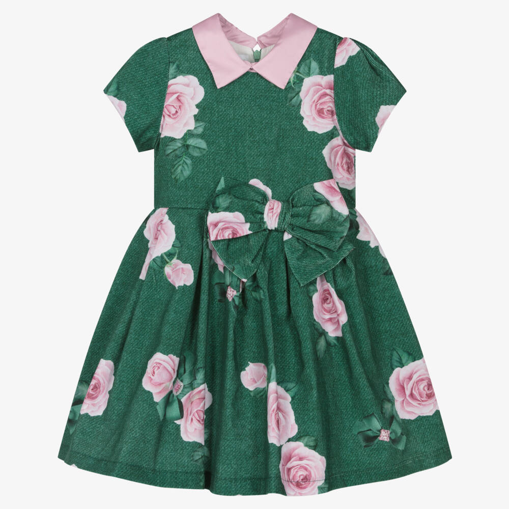 A gorgeous green cotton dress for girls by Balloon Chic, patterned with pretty, pale pink roses. Made from super fine needlecord, this beautifully soft dress is lined in lightweight voile for added comfort. It has a charming pink satin collar, cap sleeves and a statement bow on the waistline. It fastens neatly with a concealed zip and button on the back.