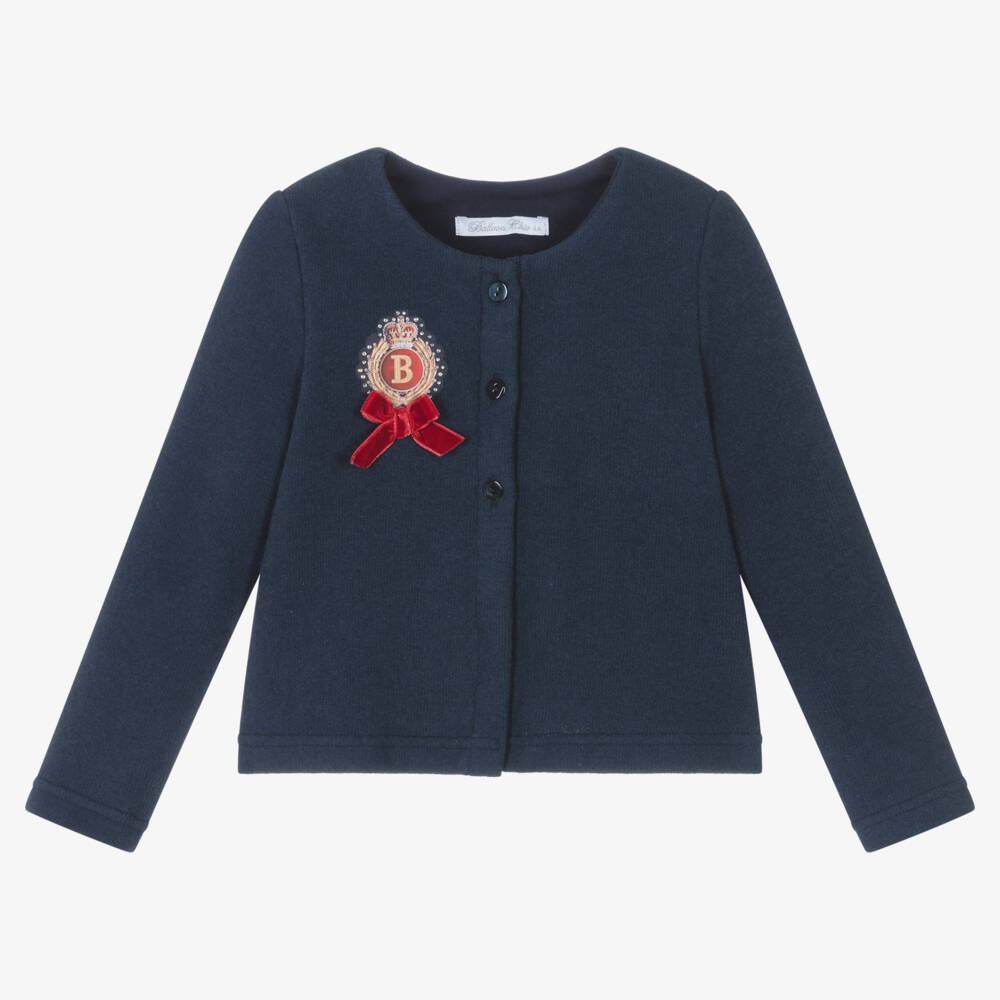 Charming navy blue cardigan for girls by Balloon Chic, made from a super soft, cosy knit. Printed on the chest is a regal, branded emblem, trimmed with diamanté studs and a red velvet bow. There are small front button fastenings, and a partial jersey lining around the chest, for additional comfort.
