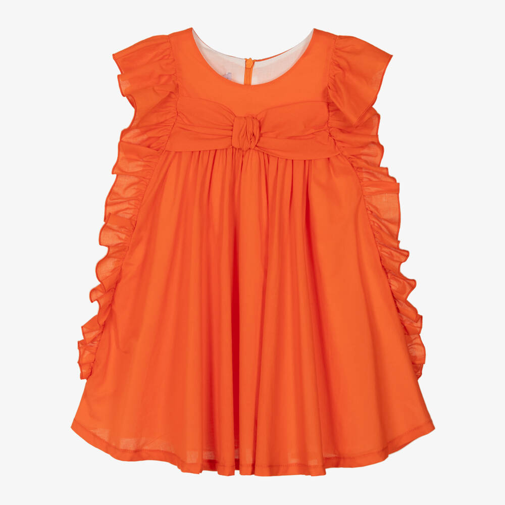 A striking bright orange dress for girls from Balloon Chic, woven in soft cotton poplin. Beautifully lightweight, it is gently gathered across the bodice creating a full and floaty skirt. There is a gorgeous ruffle trim over the shoulders and extending down the sides of the dress, with a bow on the front adding a pretty finishing touch. Fully lined in lightweight voile, the dress fastens neatly on the back with a concealed zip.
