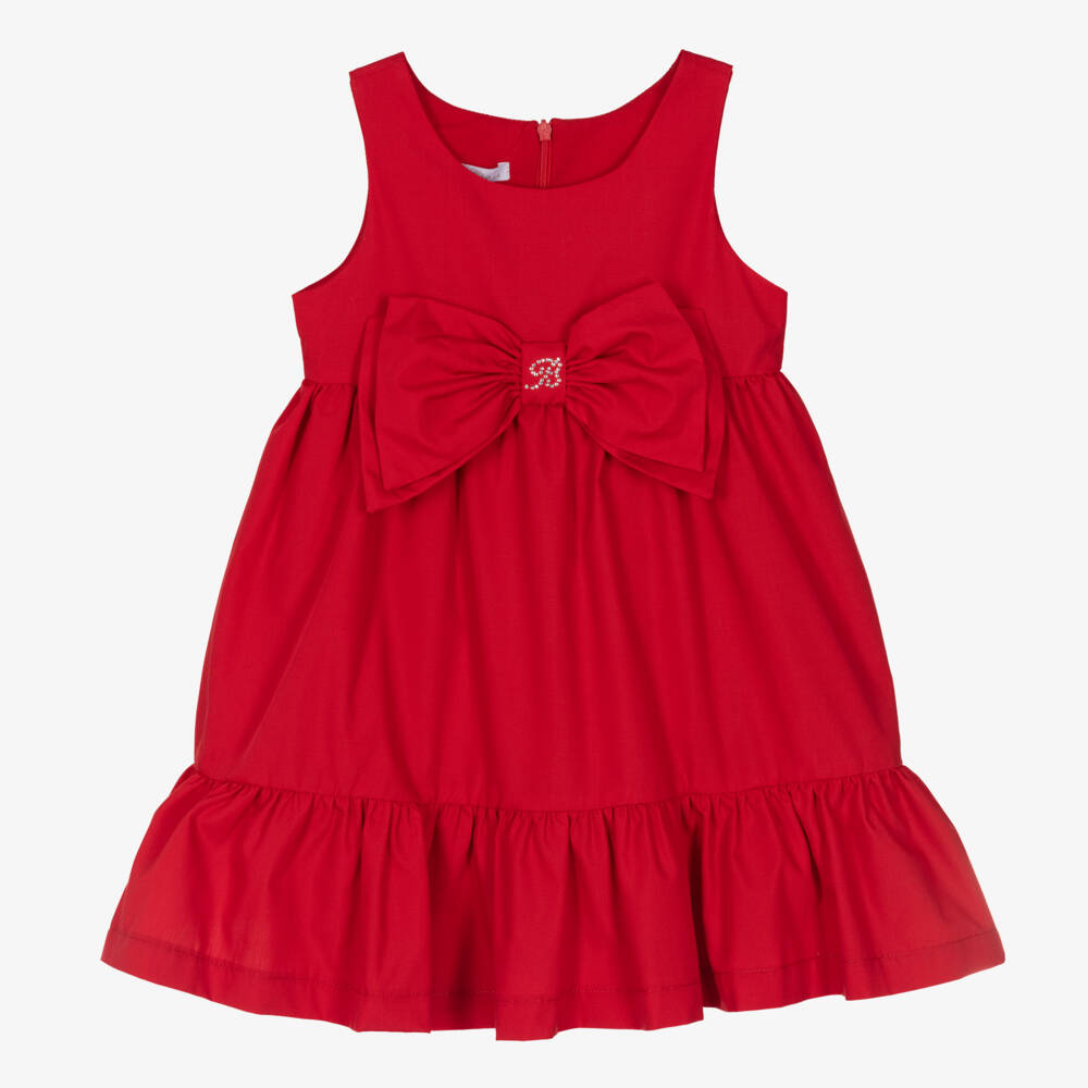 A red dress for girls from Balloon Chic, woven in soft organic cotton. In a classic sleeveless style with a pretty frilled hem, this lovely dress has a fabulous bow on the waistline, detailed with a sparkling diamanté 'B'. Comfortably lined in lightweight cotton voile, it fastens with a concealed zip on the back for a neat finish.