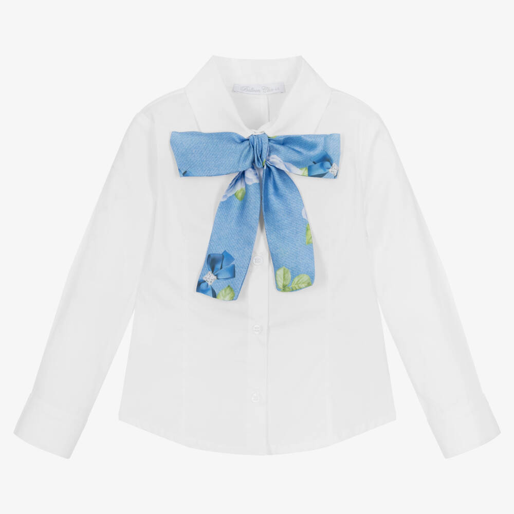 Delightful white fitted blouse for girls by Balloon Chic, made from comfortable cotton poplin with a detachable silky blue bow. This stylish top has small button fastenings and a pointed collar for a smart look.