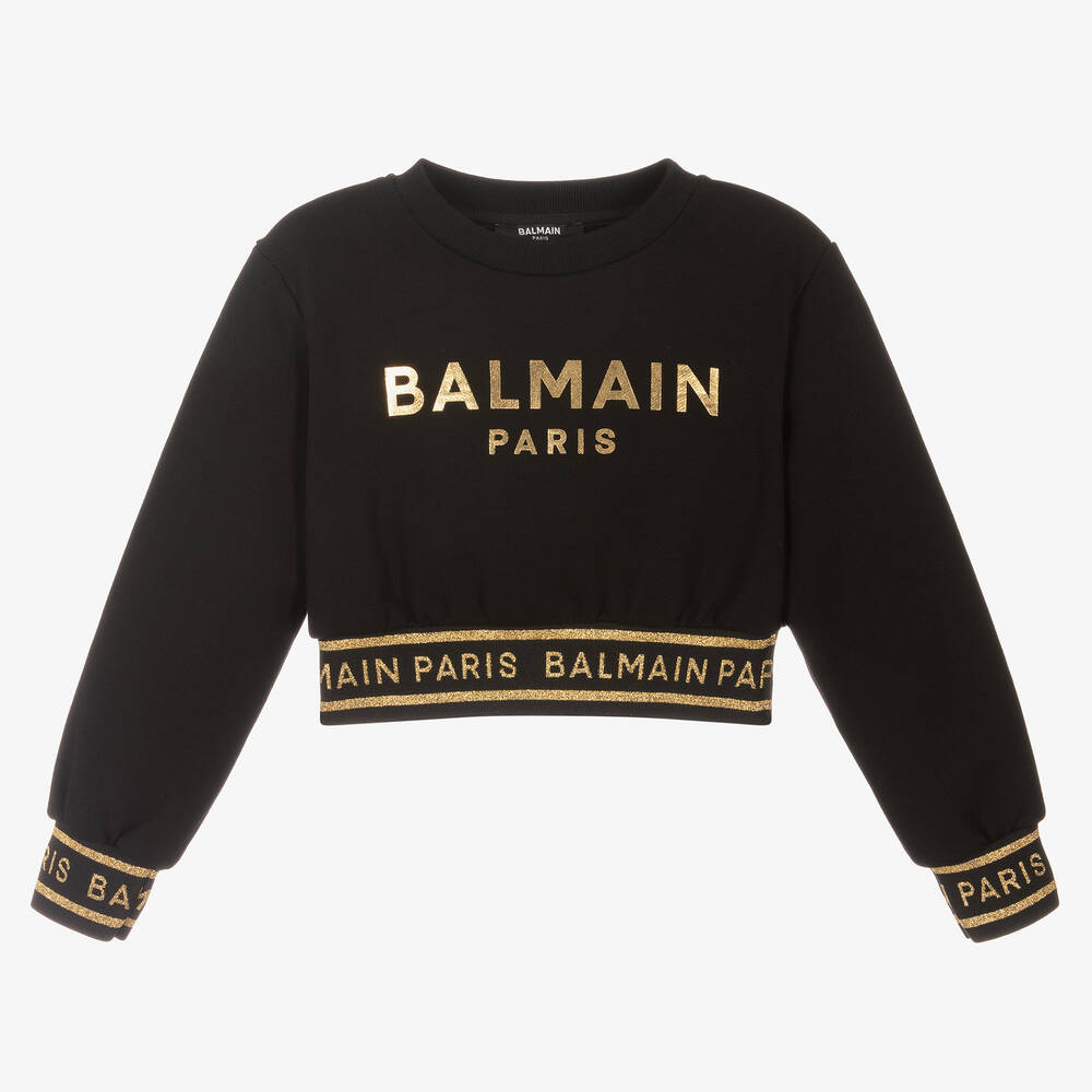 Cropped black sweatshirt for girls from luxury French brand, Balmain, inspired by the adult collection. Made in soft sustainably grown cotton jersey, it has a gold foil logo print on the chest and elasticated trims with repeat gold glitter logos.