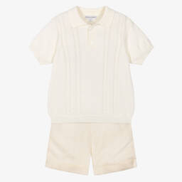A charming navy blue cotton shorts set for boys by traditional British brand Beatrice & George, exclusive to Childrensalon. The blue and white striped poplin shirt has a delightful pattern of sailing boats and is paired with navy shorts for a classic look. The shorts are made in lightweight twill, with inverted pleat detailing on the front and a soft, comfortable voile lining. Designed with an easy-to-wear, pull-up style, the shorts have an adjustable waist for an ideal fit.
