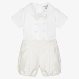 Traditional shorts set for boys in white and pale ivory by Beatrice & George, exclusive to Childrensalon and ideal for a special occasion. The white cotton shirt has an embroidered ivory logo on one sleeve, with decorative buttons on the front. It has a pale ivory, detachable bow tie and fastens with logo buttons on the back. It also buttons to the silky pale ivory slub dupion shorts, keeping boys neat and tidy. The shorts have a lustrous sheen when they catch the light and smart pleats on the front, as well as a useful, adjustable waistband for a good fit. They are fully lined for comfort and have gently elasticated cuffs.