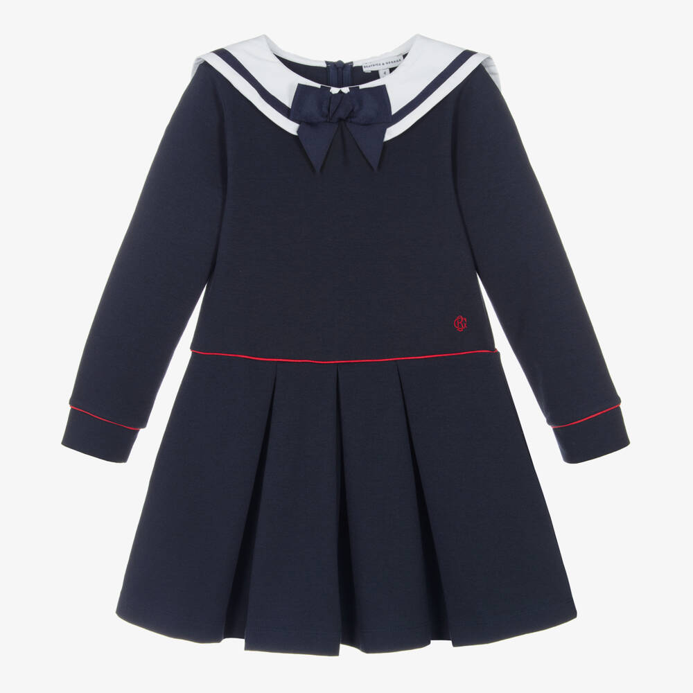 A classic navy blue sailor dress for girls from British brand Beatrice & George, exclusive to Childrensalon. Made in comfortable, cotton-rich Milano jersey, it has a traditional white collar with a navy blue grosgrain ribbon trim and a matching bow on the front. The dress has an embroidered red monogram logo on the bodice, coordinating piping and smart box pleats. It fastens with a concealed zip on the back for a neat finish.