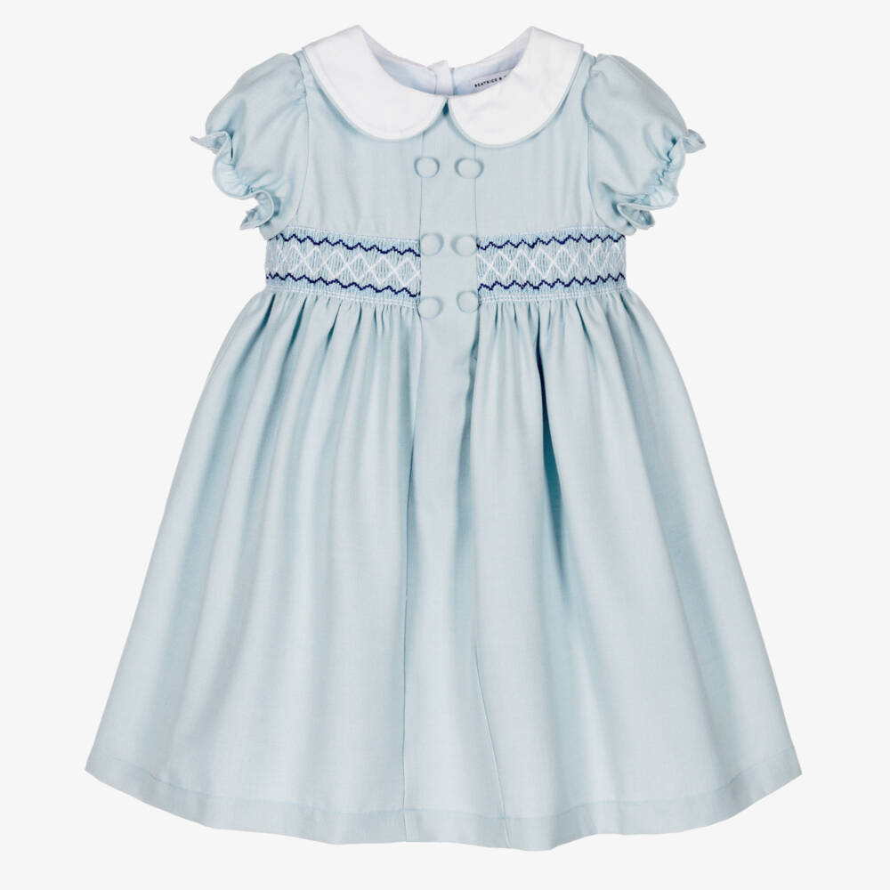 Exclusive to Childrensalon, a pale blue dress for girls by British heritage brand Beatrice & George. It has traditional smocking across the bodice with white and navy blue embroidery, as well as decorative buttons. Fully lined for comfort, it is made in a soft, mid-weight, cotton and viscose blend with a herringbone design. It has a sweet, white Peter Pan collar and pretty puffed sleeves with gently elasticated, frilled cuffs. The dress has a full, gathered skirt and fastens on the back with buttons.