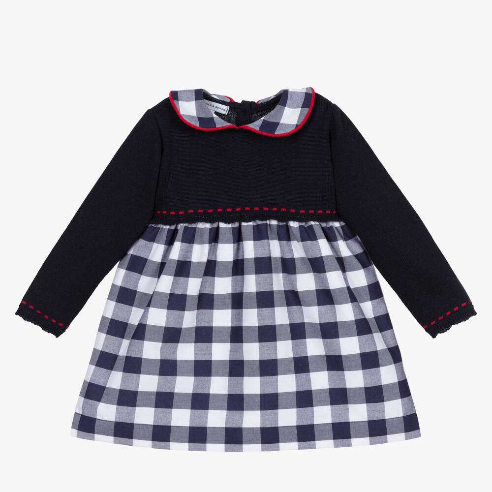 Little girls navy blue and white dress by British heritage brand Beatrice & George, exclusive to Childrensalon. With the look of a two piece, the knitted navy blue bodice has red detailing and a navy blue and white checked poplin collar with red piping. The coordinating checked skirt has a cotton lining for comfort with a pretty lace trim. The dress fastens with buttons on the back and comes with matching bloomers that have a sweet red velvet bow on the gently elasticated waistband.