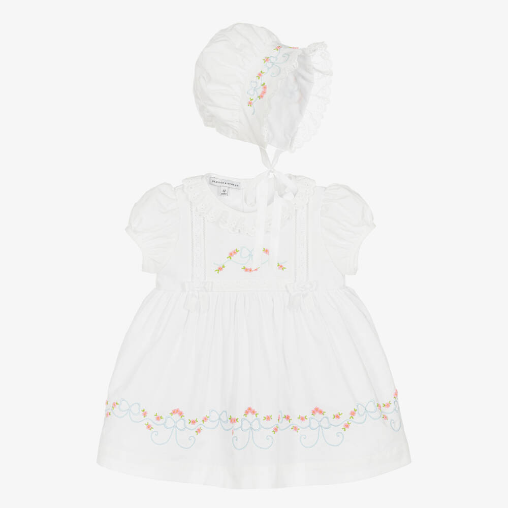 Gorgeous white cotton dress set for little girls by classic British designer Beatrice & George, exclusive to Childrensalon. The dress is exquisitely hand-embroidered with pink flowers and pale blue bows, with a scalloped lace collar, lace trims and grosgrain bows. Fully lined, it has pretty puffed sleeves and fastens with branded buttons on the back. It comes with a matching bonnet that ties with grosgrain ribbons, as well as useful bloomers.