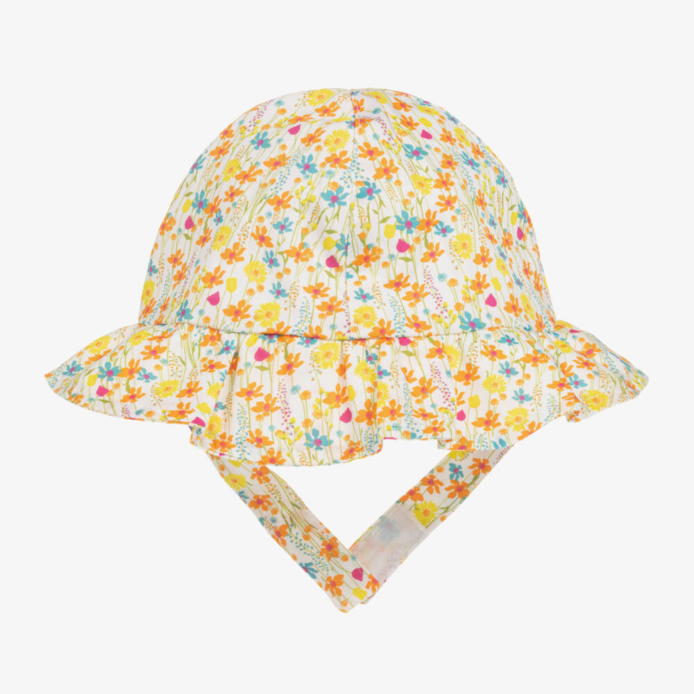 Lovely cotton hat for girls by traditional British designer Beatrice & George, exclusive to Childrensalon. Ideal for sunny days, the hat is made in cool, lightweight poplin with a lovely yellow, orange and blue floral meadow print. It is fully lined in lightweight voile for comfort and has useful, velcro-fastening straps on smaller sizes.