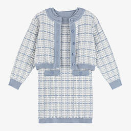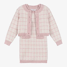 Sweet and stylish, this pale pink and ivory cardigan and dress set for girls is by Beau KiD. Knitted in a soft viscose blend for comfort with ribbed trims, the silver thread creates a delicate shimmer against the checked pattern. The long-sleeved cardigan fastens with buttons on the front, the sleeveless dress has decorative buttoned pocket details. This coordinating outfit can be styled for both smart and casual occasions.