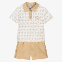 For girls from Beau KiD, a lovely pink shorts set knitted in a soft viscose blend. Both pieces have an adorable teddy bear print embellished with diamantés for a touch of sparkle. The long-sleeved jumper has embroidered frill detailing on the shoulders that complements the ruffle short hems.