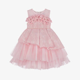 Girls will be able to party in style in this pale pink special occasion dress by British brand Beau Kid. With sheer, ribbon-trimmed mesh on the front of the shoulders, the bodice is made in beautiful lace, with a ruffle across the chest and georgette flower appliqués below, sparkling with diamanté centres. The waist is defined by pretty pearl beads, below which is a tier of asymmetric box pleats with dramatic tiers of tulle below. Fully lined in satin for comfort, there is a zip fastening on the back, a large detachable bow secured with buttons and a fixed ribbon sash.