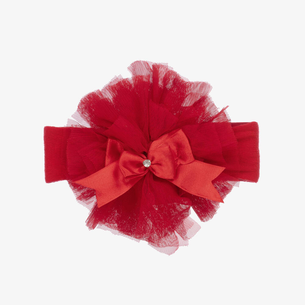 Girls stretchy red headband by Beau KiD, made from soft cotton jersey with a large tulle rosette on the top. This pretty hair accessory has a silky ribbon trim with diamanté details.
