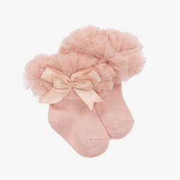 Girls pink ankle socks by Beau KiD, made in soft and stretchy cotton. They have a pretty tulle frill and satin bow.