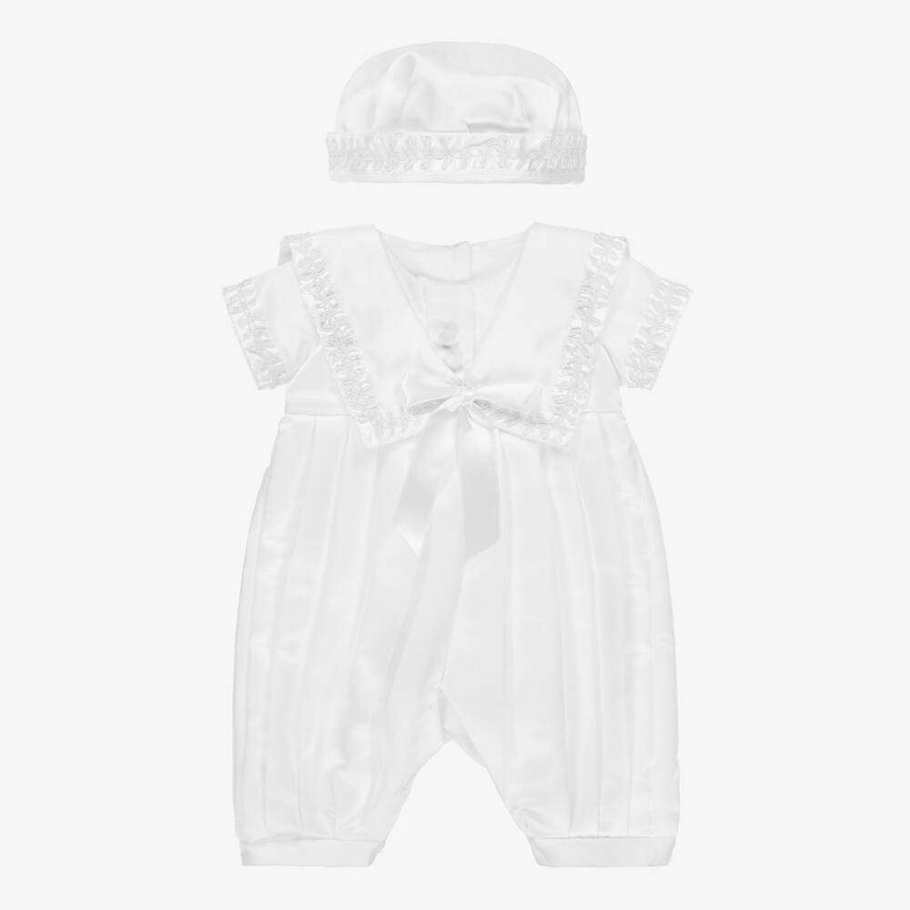 A special occasion white satin shortie for baby boys by British brand Beau Kid, with a classic sailor collar. It is trimmed with white satin ribbon and beautiful braiding detail for stand out style. Pleated on the front and gathered on the back, it has a comfortable bubble style and fastens with buttons. A sweet matching hat completes this elegant outfit.