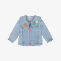 Mid blue denim jacket for girls by Billieblush, great for a party look. This timeless style has easy popper fastenings, purposely designed to resemble glittery pink buttons. It has two chest pockets, beautifully decorated with multicoloured sequins and 3D flowers.
