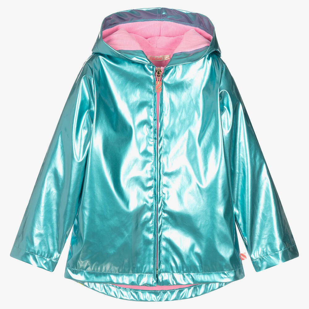 Striking iridescent blue raincoat for girls by Billieblush, lined in soft pink jersey for comfortable wear, with a smooth water-resistant coated exterior. The brand's logo is printed in colourful glittery letters on the back, for an eye-catching style. It has a useful zip fastening, pockets and a large hood to protect your child from the elements.