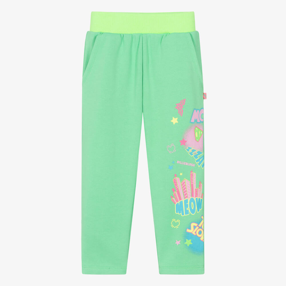 Green joggers for girls by Billieblush, made in soft, mid-weight cotton sweatshirt jersey with a warm, fleecy inside. Part of the DC Comics capsule, they have colourful, glittery super hero slogans printed on one leg. Casual and comfortable, they have slanted front pockets and a contrast neon green ribbed waistband.