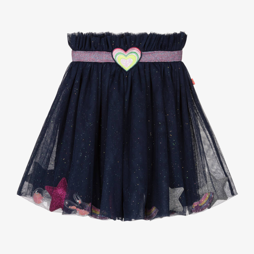 Lovely navy blue tulle skirt for girls by Billieblush, with colourful sparkles all over. The outer layer of this cute skirt is filled with little stars, rainbows and bunnies in glittery pink, and silver which can move around for an added playful element. Easy to pull on with a sweet belted look, it has a shimmery purple elastic waistband with a ruffled top and a glittery heart appliqué on the front to finish off the look. It is lined in soft viscose for optimum comfort.