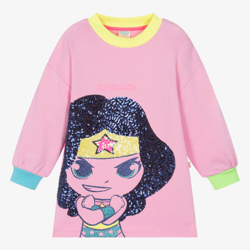 Pink sweatshirt dress for girls by Billieblush, made in soft, mid-weight cotton with a warm, fleecy inside. Part of the DC Comics capsule, it has a large eye-catching sequin and glitter Wonderwoman motif on the front, with a glittery pink logo above. This striking, casual dress has neon ribbed trims and a stylish split hem.