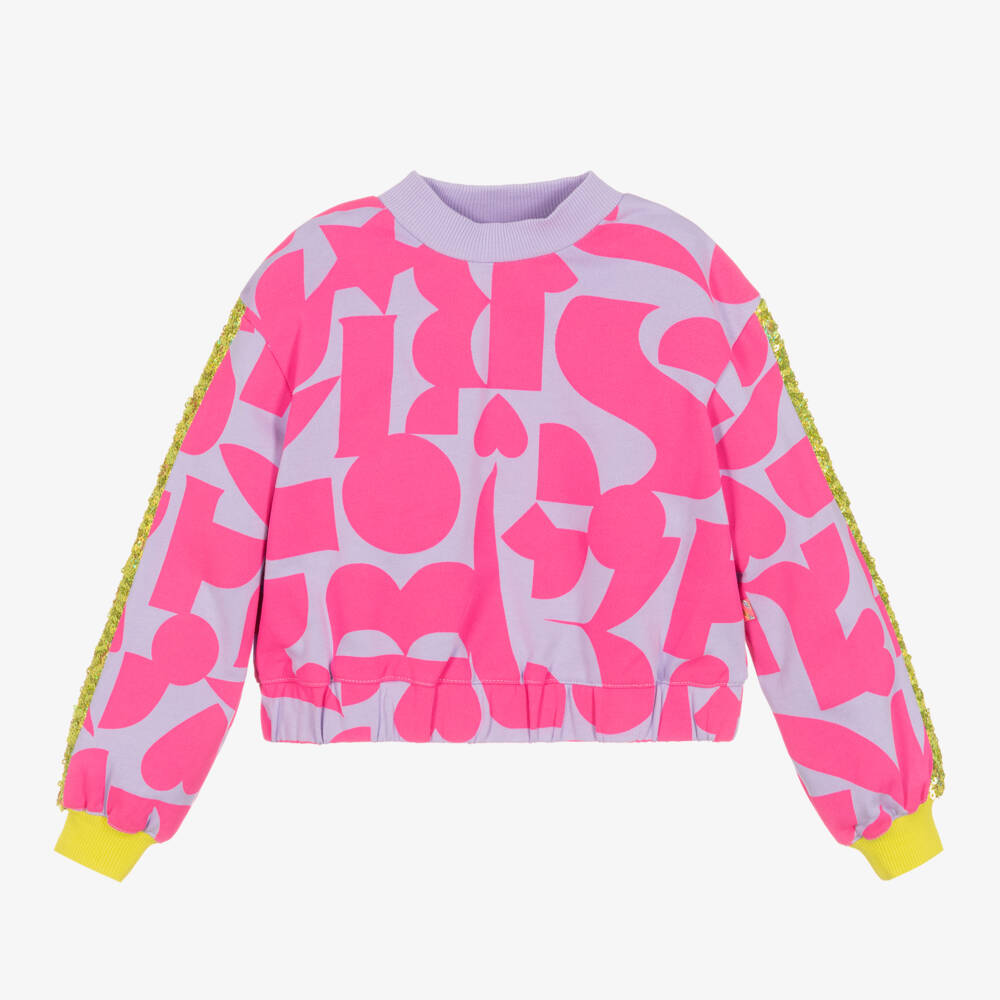Cool and casual lilac purple sweatshirt for girls by Billieblush, with a neon pink abstract logo print. Made in mid-weight cotton jersey for comfort, this fun sweatshirt has contrasting neon yellow ribbed cuffs and sparkly gold sequin panels down the arms for an eye-catching finish.