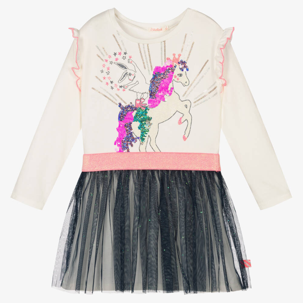 Ivory dress for girls by Billieblush, made in soft jersey with a sparkly navy blue tulle skirt overlay. It has ruffle shoulder trims and a sequinned unicorn print on the front in pink, green and blue.
