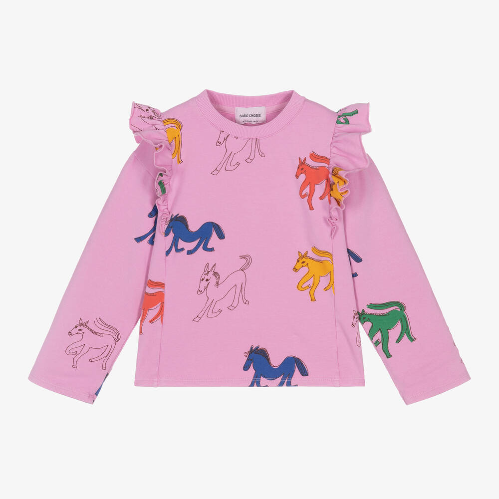 A lilac pink sweatshirt for girls from Bobo Choses, made in soft, mid-weight organic cotton with pretty shoulder frills. The Spanish designer has styled this relaxed-fitting top with quirky and characterful horses in a rainbow of colours. It has long sleeves and a fleece feel inside for extra cosiness. The brand's initials are embroidered on one sleeve in bright yellow for a small designer touch.