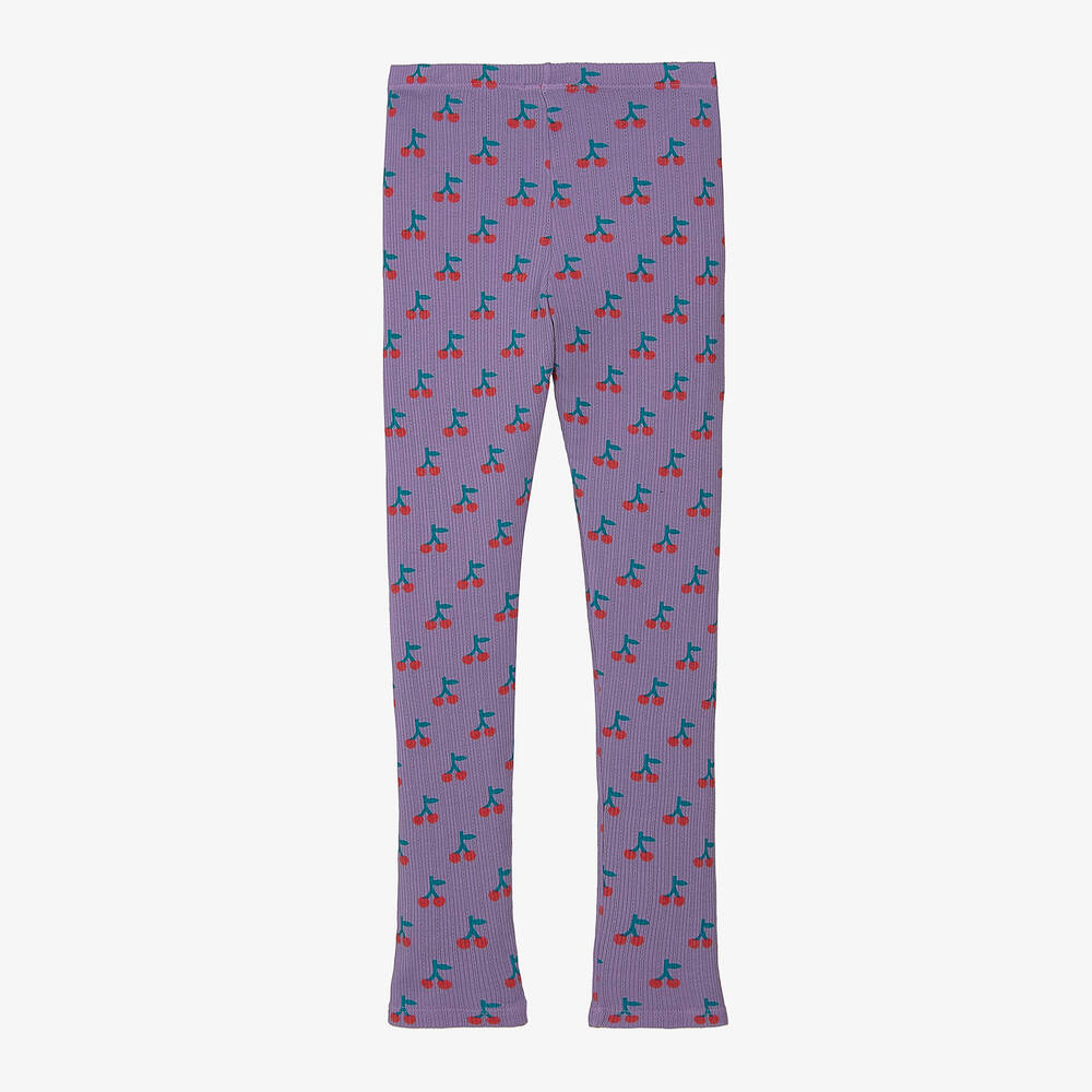 Purple organic cotton leggings for girls by Bobo Choses, patterned with a fun and playful cherry design. Made in soft and stretchy jersey, these full-length leggings have a comfortable elasticated waistband.