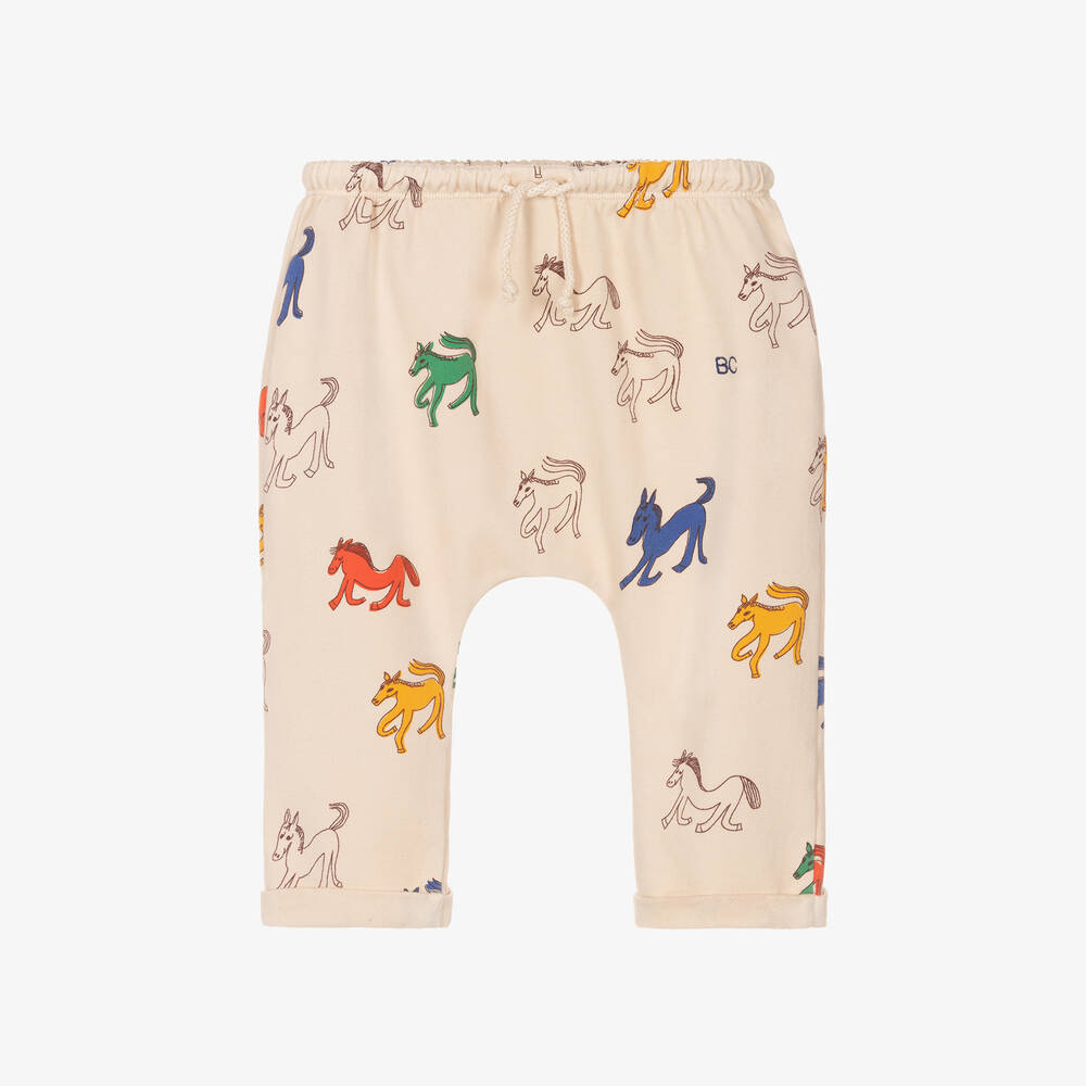 Dark ivory joggers for baby boys and girls by Bobo Choses, made from soft, mid-weight organic cotton jersey. Patterned in fun and playful horses in a mix of bright colours, these comfortable joggers are styled with little turn-up cuffs. Beautifully soft and fleecy on the inside, they have a gently elasticated waistband with adjustable drawstring ties. For a discreet designer look, the iconic BC logo is embroidered in blue on the front.