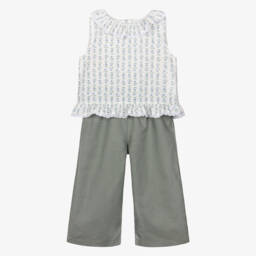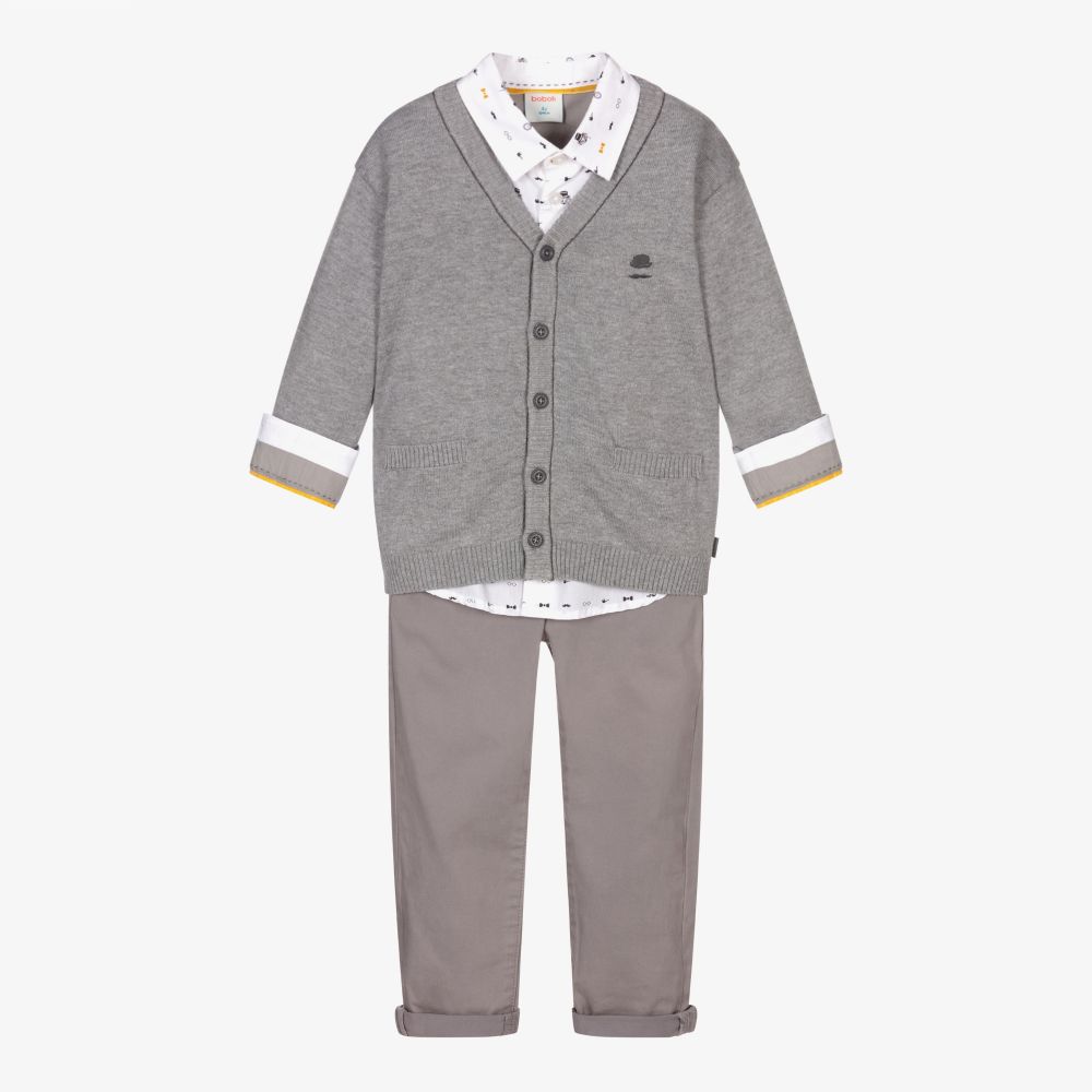 Three piece trouser set for boys by Boboli. The white shirt is made in lightweight cotton with a spectacle, bow tie and moustache pattern in black and yellow. The grey cardigan is knitted in a soft cotton and wool blend. It has front pockets and a grey embroidered bowler hat and moustache on the chest. The grey chino trousers have button-fastening back pockets and an adjustable waistband.