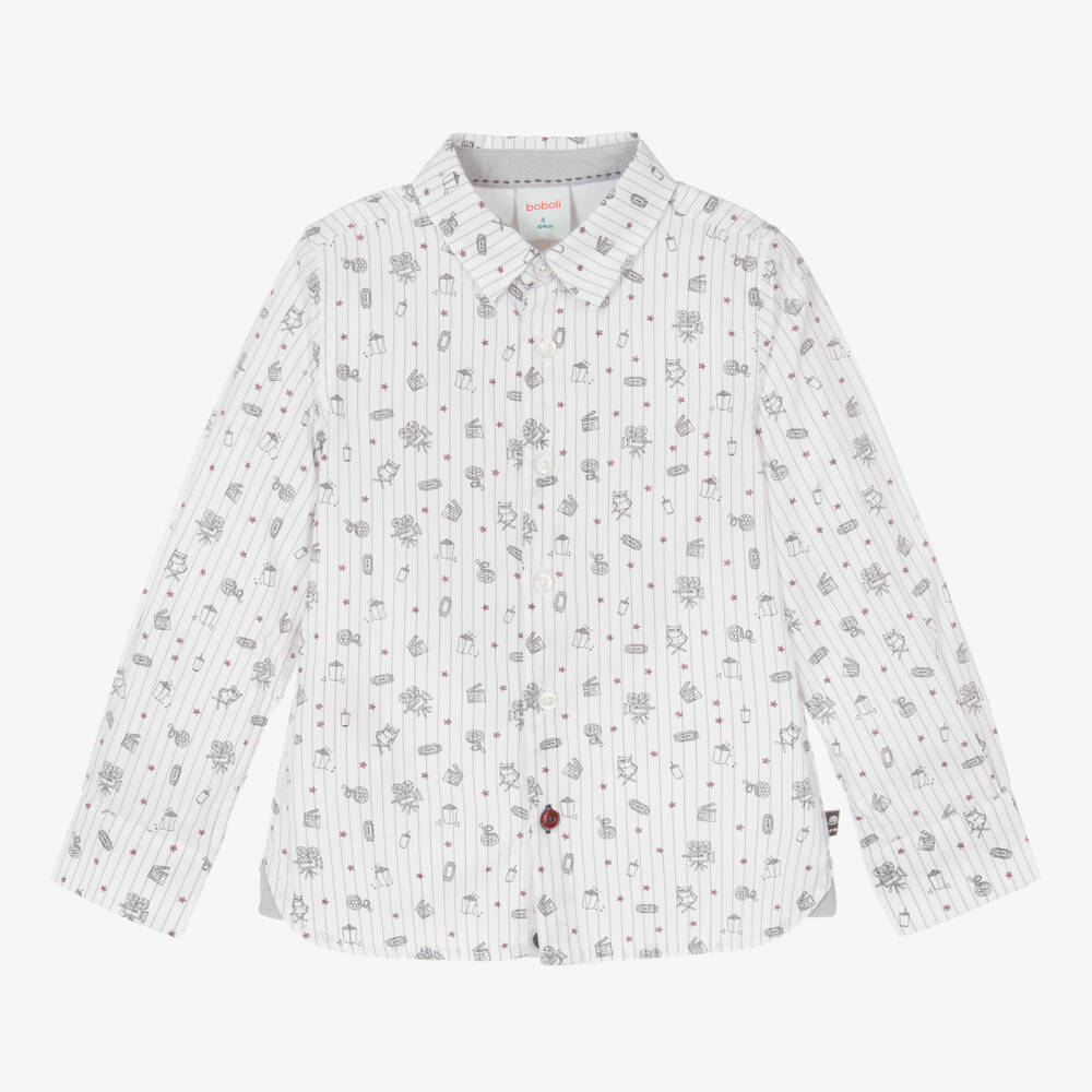 Ivory cotton shirt for boys by Spanish brand Boboli. This slim-fit style is patterned with grey stripes, red stars and black movie-themed prints. Soft and lightweight, it fastens with pearlised buttons on the front and red buttons on the cuffs for a stylish contrast.