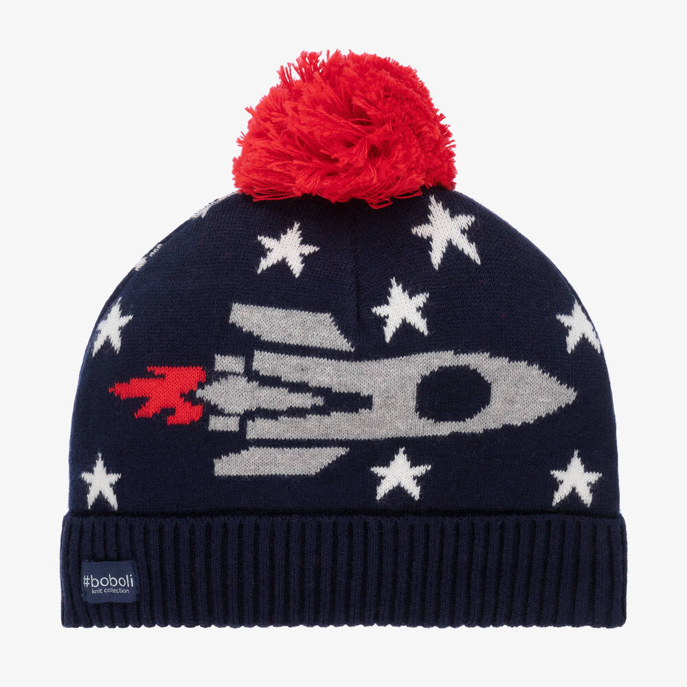 Navy blue hat for boys by Boboli, knitted in a soft cotton, viscose and wool blend. It has a fun grey rocket and white star motif on the front and a small logo tab on the turned-up, ribbed brim. There is a bright red pom-pom on the top and a cosy plush lining for extra warmth.