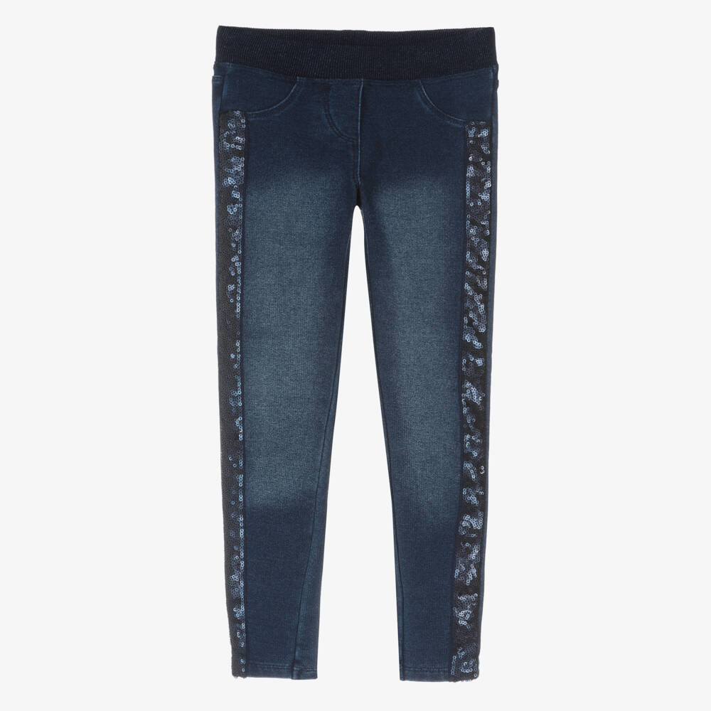 Blue cotton-blend jeggings for girls by Spanish brand Boboli, with eye-catching bands of shimmering sequins on the sides. Made in comfortable, stretchy jersey with a casual, washed and worn denim look, they have an elasticated waistband an useful back pockets.