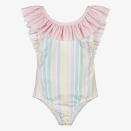 Silky soft and smooth green and white polka dot swimsuit for little girls by Spanish brand Boboli. Vibrant and girly, it has a strawberry with sparkly pink cheeks printed on the front, and a frilly green leaf appliqué. It has ruffled trims and an open back, with a useful clip fastening on the neck.