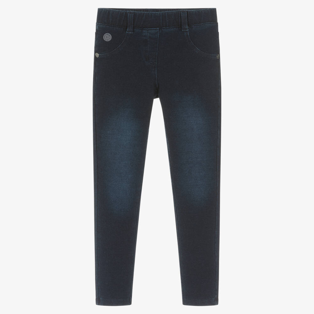 Easy-to-wear navy blue jeggings for girls by Boboli, made from soft and stretchy cotton jersey. They have faux pockets on the front with a rubberised logo badge, and functional pockets on the back. The knees have a washed denim effect and the waist is comfortably elasticated.