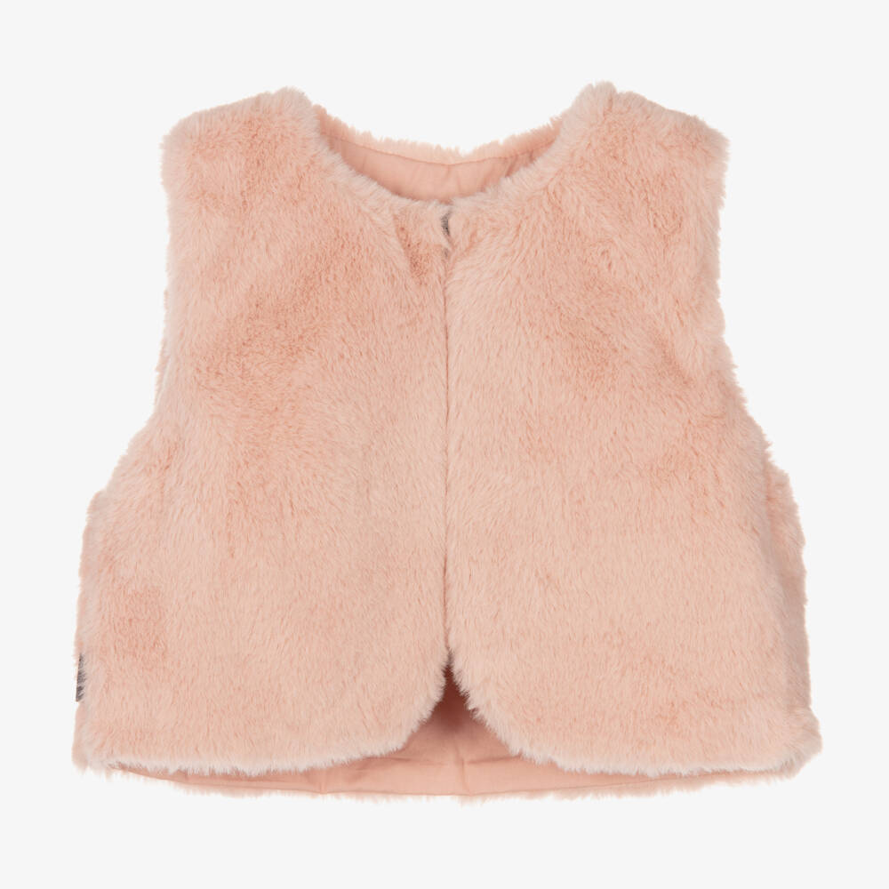 A pale pink gilet for girls by Boboli, made in the softest faux fur. Lovely for layering over an outfit, it fastens easily with a hook and has a soft cotton voile lining.