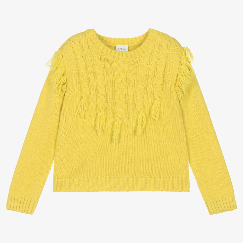 Lime yellow sweater for girls by Boboli, knitted in a soft wool blend. It has a lovely cable knit detail on the chest, with tassel trims for a cute look.